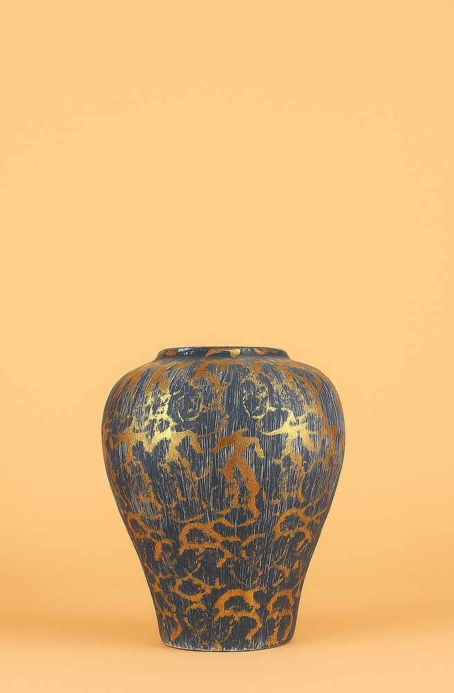 Stylová váza s hluboce modrým podkladem a výrazným zlatým dekorem přináší do interiéru výrazný akcent s nádechem elegance a originality. Ručně malovaný povrch vytváří nepravidelný zlatý vzor, který v kombinaci s tmavým podkladem evokuje orientální nebo vintage estetiku. Díky kompaktním rozměrům se váza skvěle hodí na komodu, polici nebo jídelní stůl, kde zaujme i bez květinové výzdoby.Díky ruční výrobě je každý kus jedinečný – mírné odchylky v textuře a barvě jsou důkazem řemeslného zpracování. Ideální pro suché dekorace nebo jako solitérní doplněk v moderním i klasickém interiéru.Hlavní výhody produktu: